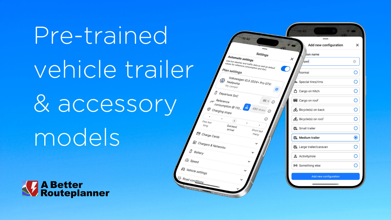 Are you planning to drive a camper trailer this summer? ABRP now includes built-in consumption models for common accessories through our vehicle configurations feature. Once you begin your journey and provide real-time data, we will adjust the model to fit your specific setup even better.