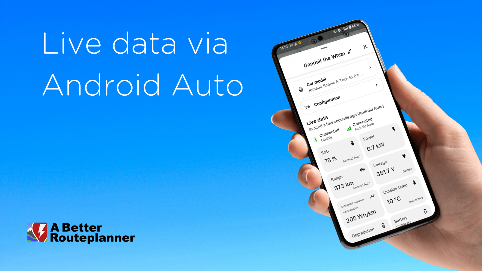 Just pair your phone with your car, accept the permissions to get car data for ABRP, and you're offβ€”it's the easiest live data setup so far! This requires a modern vehicle with support for AA data, but more and more vehicles have it.