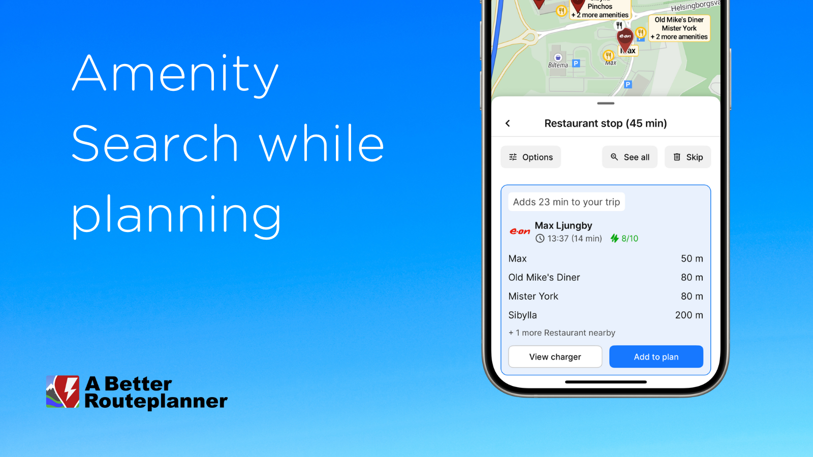 Together with the Add Stop feature added in ABRP 5.7, we now offer a search for suitable chargers on your route with, e.g., a few restaurants for a lunch break or simply a quick bathroom break. Always be charging!