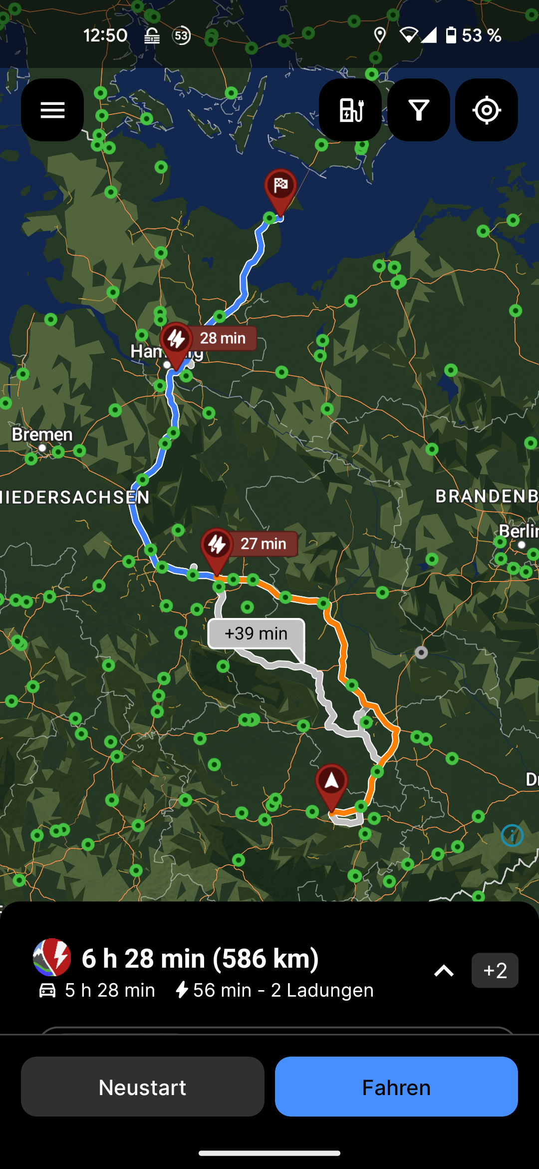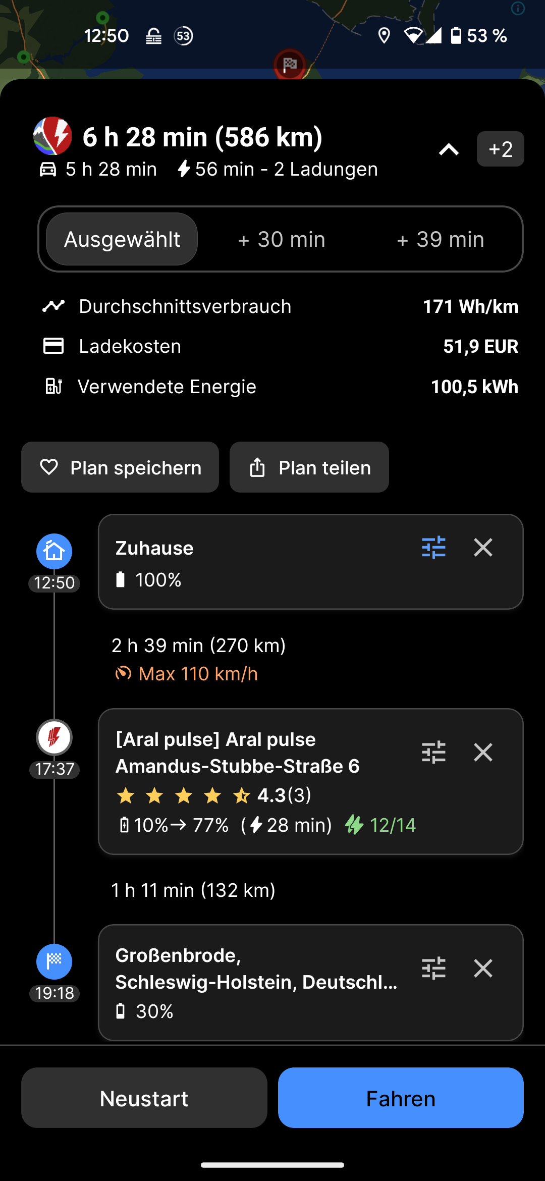 The itinerary does not show the first charging stop, but it appears on the map.