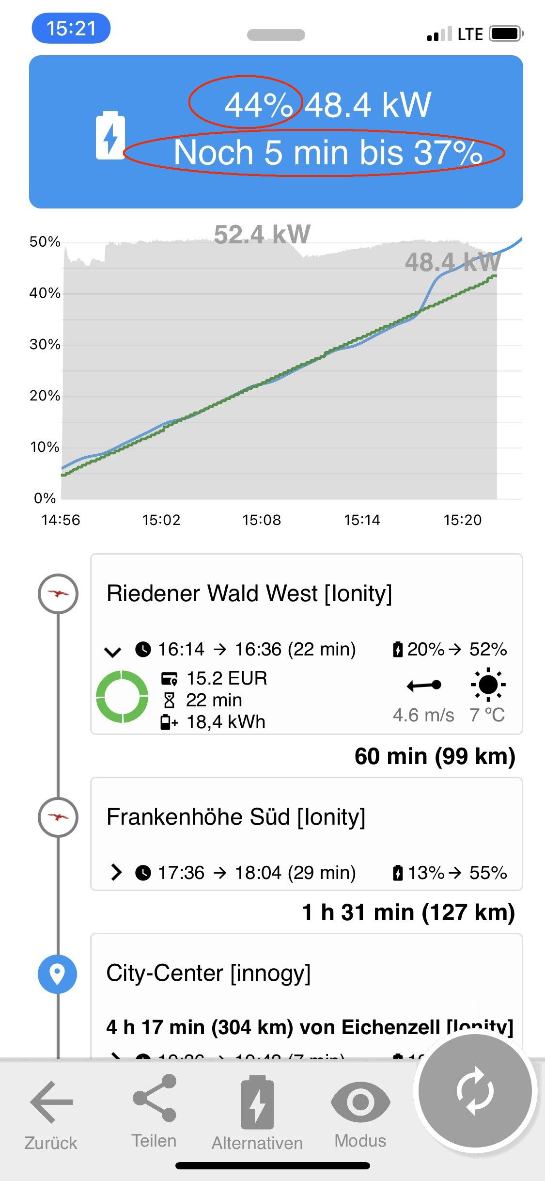 In the current example, ABRP intended to charge up to 37%. In fact, I've charged to 44%. ABRP then says I have to wait another 5 minutes until 37% is reached. That's just plain wrong.