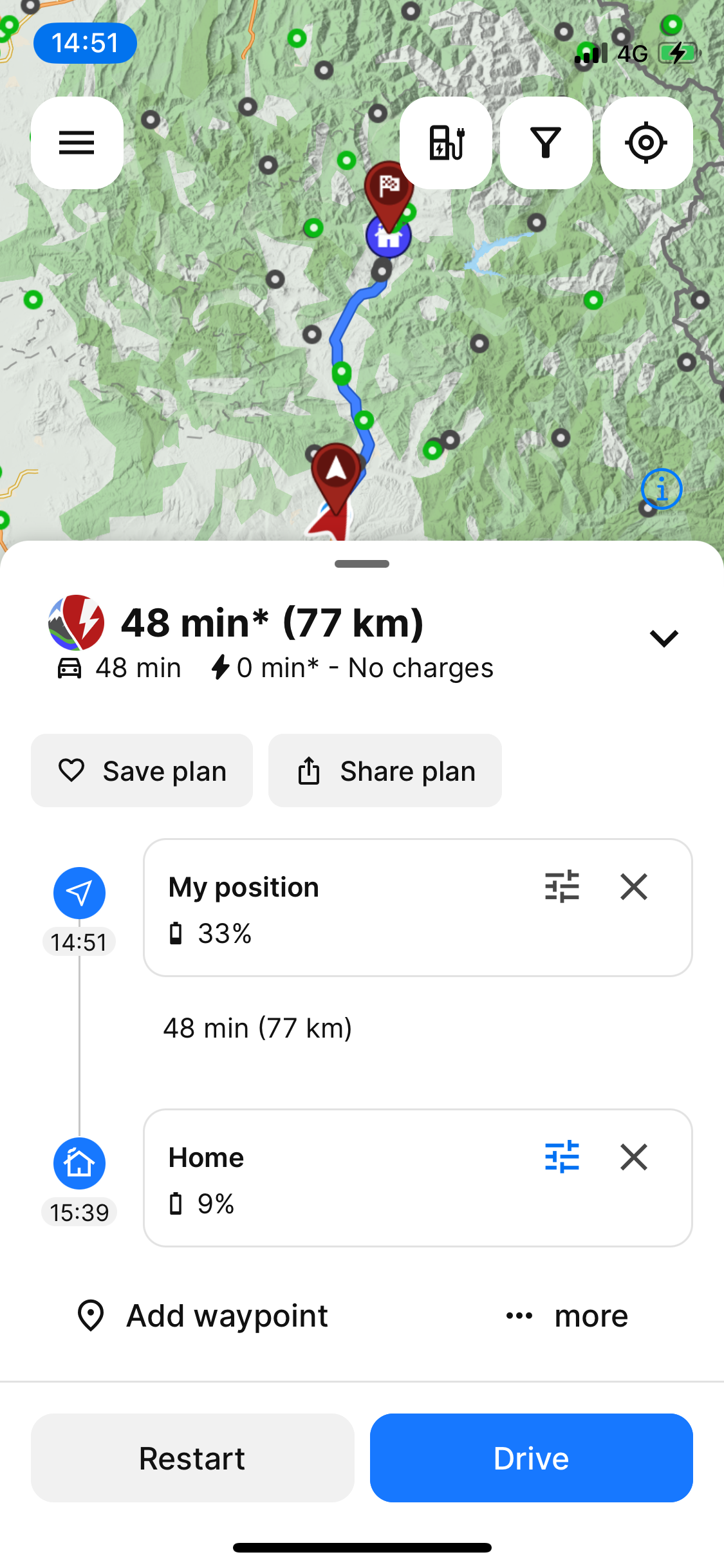 Navigation displays unrealistically optimistic ETA and battery remaining values (screenshot 1) Despite the planner showing correct values (screenshot 2). Once the ETA reaches zero it becomes negative.