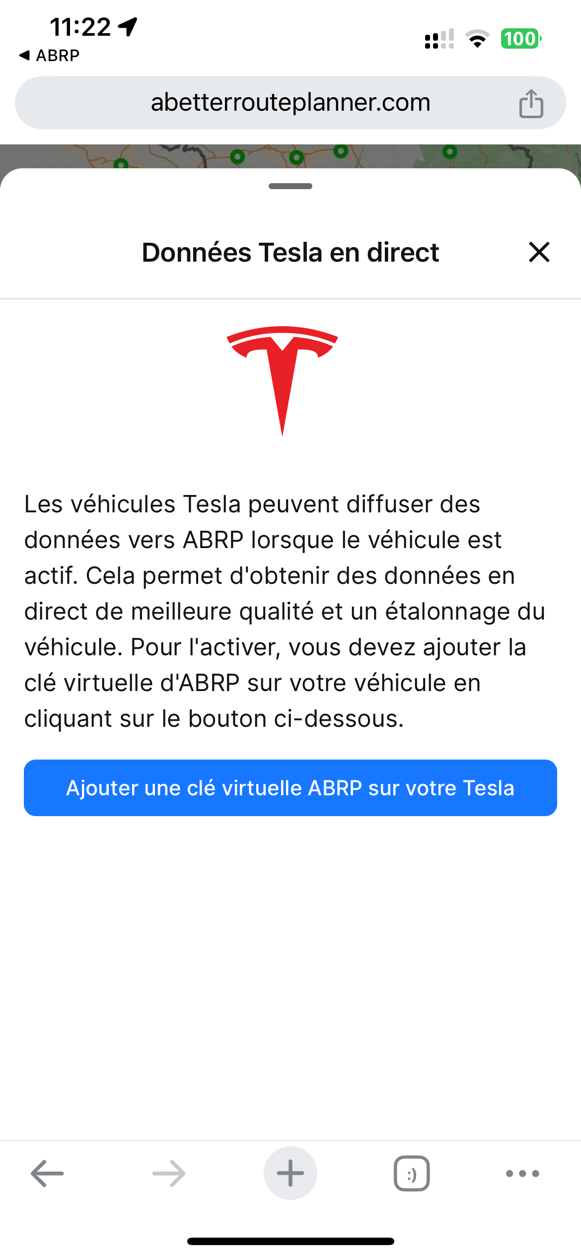 Quand je clique sur le VIN de ma tesla dans ABRP, cela m’ouvre l’écran de l’application Tesla et me dit qu’il n’y a pas besoin de clé sur ce model