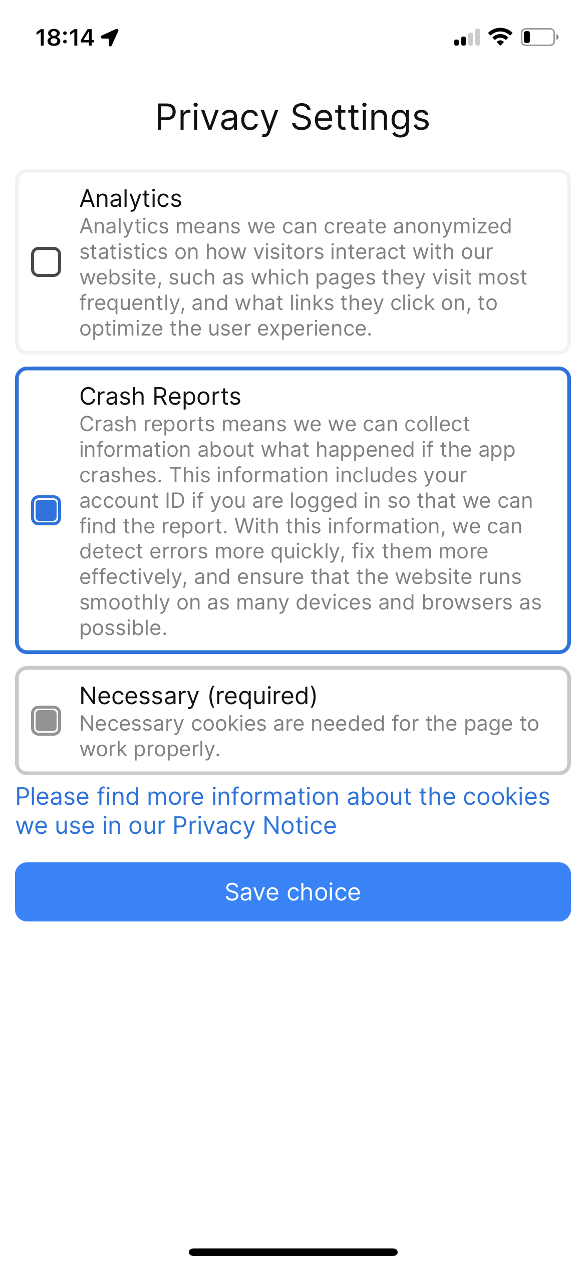 The privacy settings are now displayed in German language.