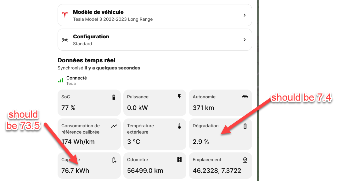 Current battery capacity is wrong in ABRP, so it is normal that battery degradation is wrong (more than half below Teslamate, Teslogic or Teslafi estimates)