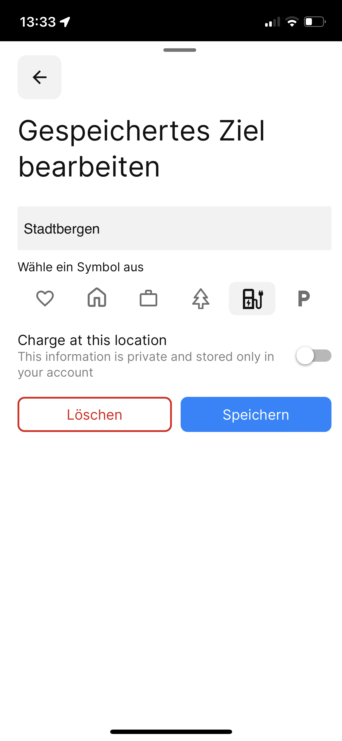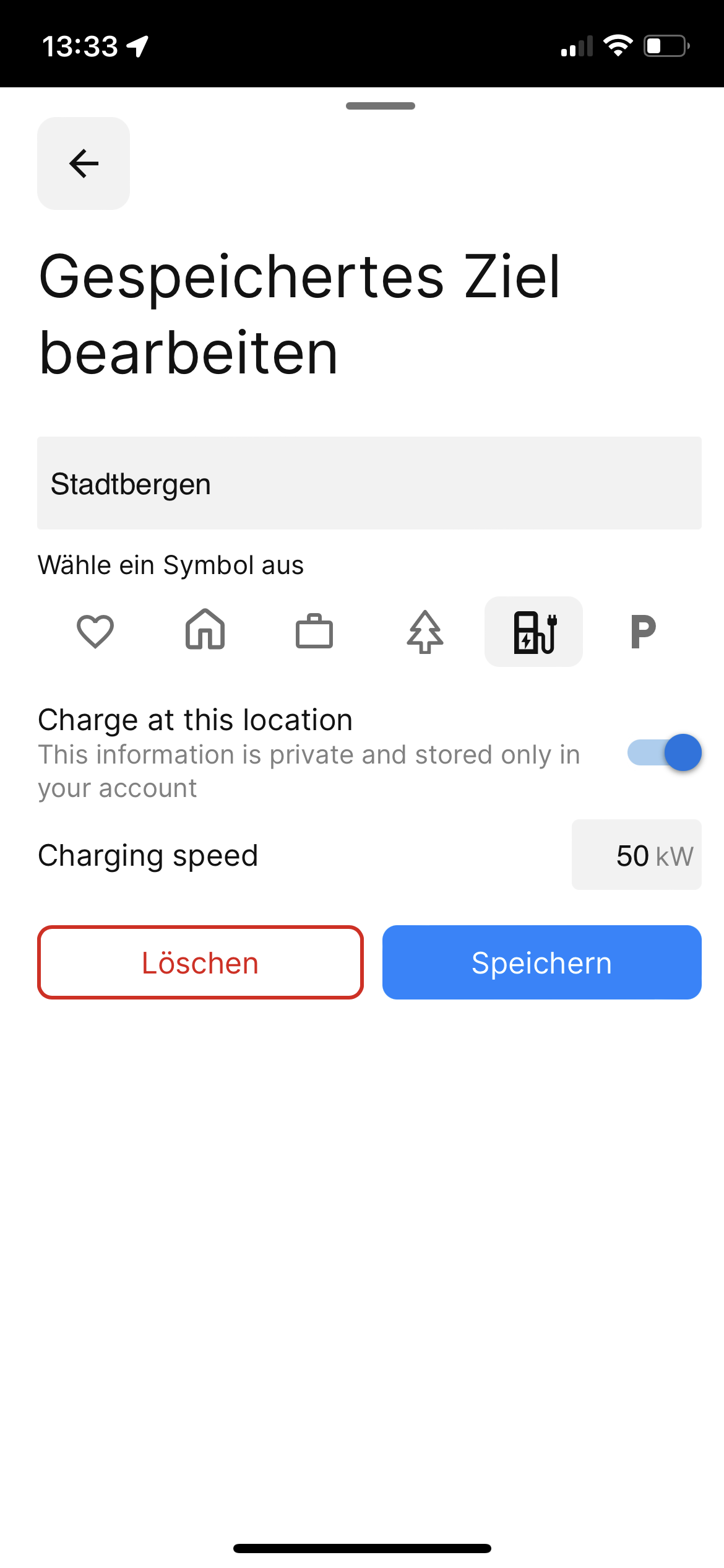 The setting for "Charge at this location" and the value for the charging speed are not saved for the saved destinations